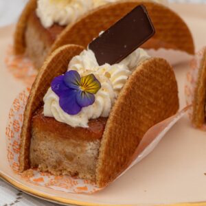 O Stroopwafels Cake traz três camadas de pão de ló, geléia de morango, uma bolacha de Stroopwafels dividida ao meio e coberta com chantili de caramelo.