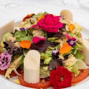 A leveza e refrescância também estarão presentes em opções de entradas, como a Salada de Flores que é um mix de folhas de salada tradicional e flores comestíveis, molho de mostarda dijon e mel, nozes, palmito e tomate.